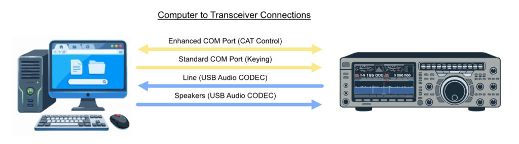In the old days, interfacing with a radio was complex and required two different cables. CAT control took place through an RS-232 cable while RTTY/Data, audio input and output and transmitter keying were done using a special 6-pin Mini-DIN data/packet connector cable. In modern setups, both of these cables have been replaced with a single USB cable which greatly simplifies the connection process. Unfortunately, the connection process is a bit confusing because the industry has implemented the USB interface in a way that emulates the old two cable method making it more complex than it really needs to be.