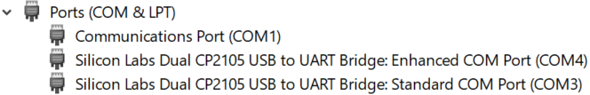 - Open Windows Device Manager, click on ‘Ports (COM & LPT)’ and verify that you have two ‘Silicon Labs Dual CP2105 USB entries’. While doing this, take note of the COM port numbers used for each device since you will need this information later in the process. On my system ‘COM4’ was used for ‘Enhanced’ and ‘COM3’ for ‘Standard’ but your values may be different.