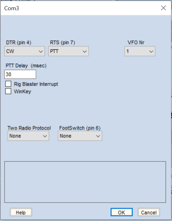 - Select ‘OK’ to save the changes and ‘OK’ a second time to close the ‘Configurer’ dialog. This setup is simpler than the one for the Advanced COM port because there’s no data transfer involved, Yaesu keys the radio based only on the state of the DTR pin or the RTS pin. So essentially, only a single line is used on this port.