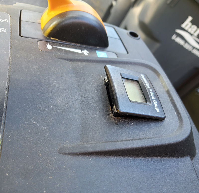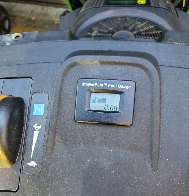 - Put the key in the ignition and turn it one stop to the right to the ‘headlight’ position. If all goes well, the fuel level and number of hours should be displayed. Sadly, the hours reset to 0 and can’t be changed,, so the number of hours reflects how many hours have passed since you last changed the fuel gauge, not how many hours you’ve operated the tractor. This isn’t really a problem for me since I keep track of each time I’ve mowed and what maintenance I’ve done in a spreadsheet, but it’s just another indication of Deere’s disregard for its customers.