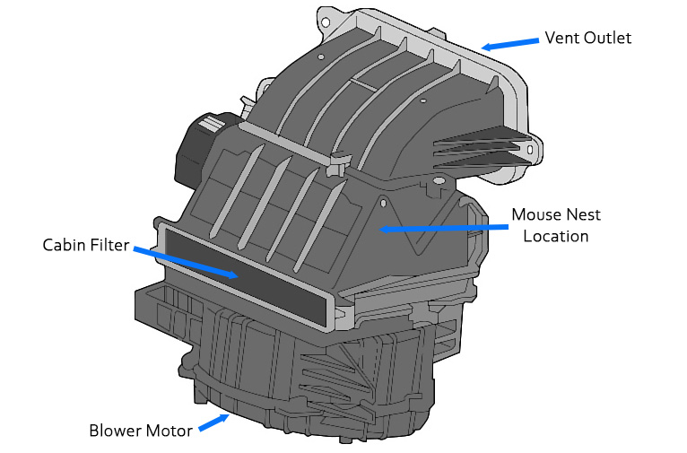I was able to dig up some photos and diagrams of the whole assembly and found that it was actually pretty simple. The intake on the firewall leads to a chamber, and at the bottom of the chamber is the cabin filter. Below the cabin filter is the blower assembly. When the mice get into the vent, they can build a nice, comfortable nest on top of the cabin filter. When you slide out the cabin filter to replace it, acorns and debris from the nest fall into the blower assembly and act like a ball spinning on a roulette wheel when you power on the blower. Yet another bad design. If they really wanted to fix the problem, they could put a screen over the inlet as the guy on the Internet did, and as a fallback, put a second panel above the cabin filter, which you could pull off, allowing you to vacuum out the area before taking out the cabin filter, preventing any debris from entering the blower. Unfortunately, I guess the allure of making $265 every time someone had a mouse infestation was just too much for them.